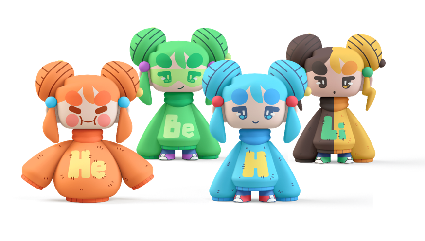 Como parte del proyecto se diseñó la primera serie de figuras, que consta de 4 variantes: Hidrógeno (la forma base de UMA), Helio, Litio y Berilio. Cada una de ellas cuenta con su propia paleta de color, reflejada en sus packaging personalizados.